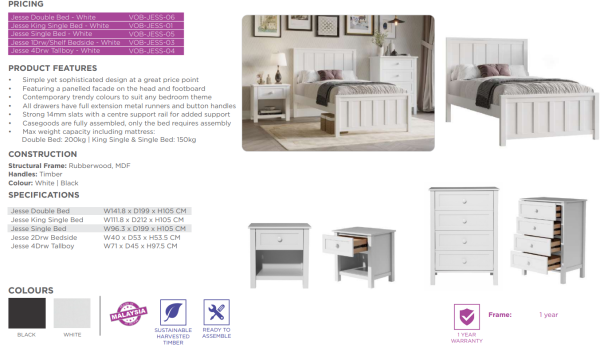 The Jesse Double Bed offers a timeless panelled design, crafted from a blend of solid rubberwood and MDF for strength and style. Its clean lines and contemporary white finish make it the perfect addition to any modern or coastal-inspired bedroom. Combining practical support with elegant simplicity, this bed is built for comfort and longevity.