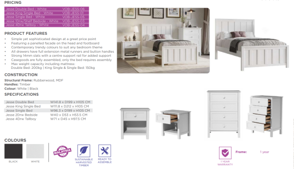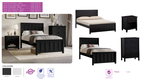 The Jesse Single Bed is a timeless classic with a sleek matte black finish, perfect for guest rooms, teens, or compact spaces. Featuring the signature Jesse panel design on both headboard and footboard, this bed combines strength, elegance, and simplicity for a refined bedroom setup.